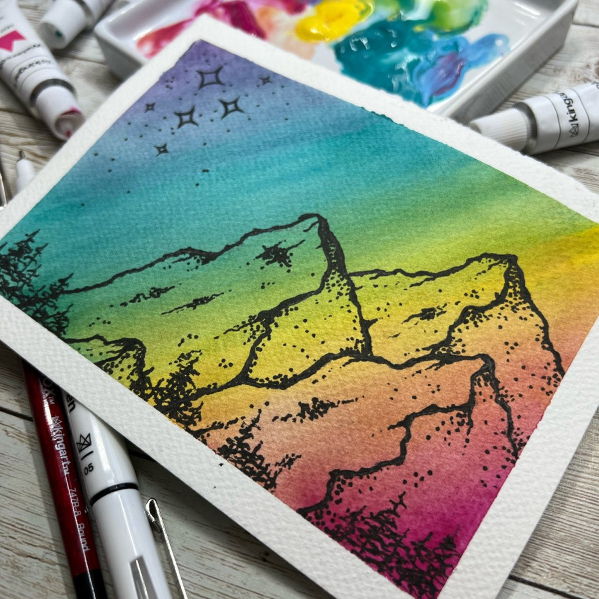 My favorite tools are the Finesse brushes, Inkline pens, Pro Artist Watercolor half-pan set, Pro Artist Gouache, the 49-hole plastic brush holder, and the plastic palette and knife assortment.
