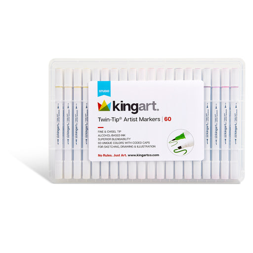 KINGART® Studio Twin-Tip™ Permanent Alcohol-Based Sketch Markers, Storage/Travel Case, Set of 60 Unique Colors, Perfect for Illustration Adult Colo...