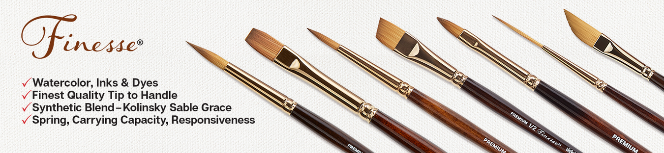 The properties of the finest Kolinsky sable, in an animal-friendly alternative filament. Each KINGART Finesse Watercolor brush head is meticulously hand-shaped from a proprietary blend of fine synthetic hair in minimum of three thicknesses to most closely mimic natural hair. This fine mix enables them to hold an abundance of water, while retaining their spring and response to the hand of the artist. Durable and more affordable than comparable quality natural hair brushes, they are exceptional for watercolor, inks, dyes, and other light media but also work well with oil, gouache and acrylic.