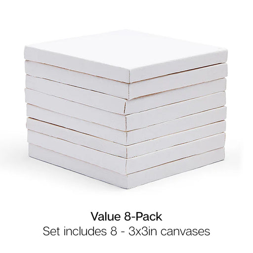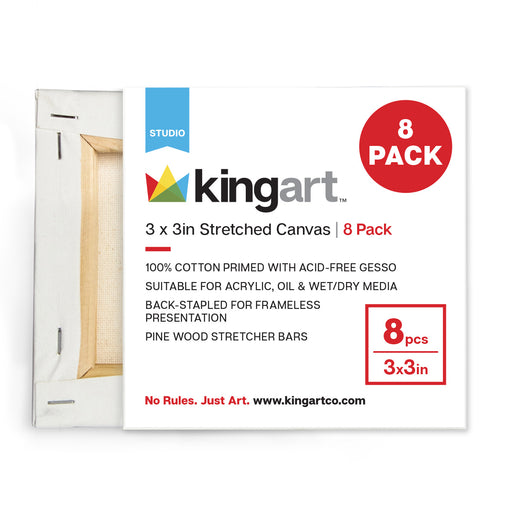 KINGART® Stretched White Canvas 3"x 3", 100% Cotton, Gesso-Primed, 8-Pack 5/8” profile Pine wood stretcher bars Smooth clean white surface Pulled...