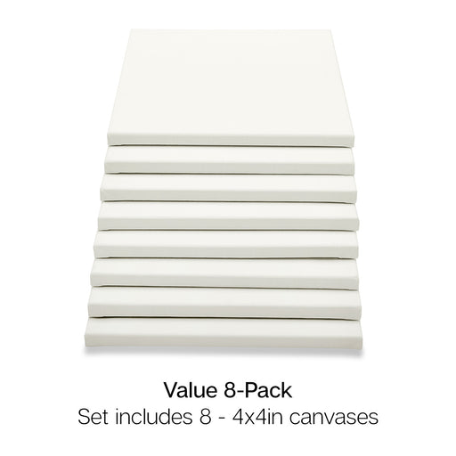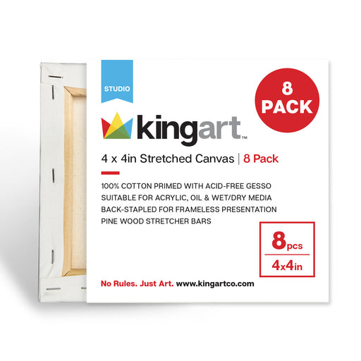 KINGART® Stretched White Canvas 4" x 4", 100% Cotton, Gesso-Primed, 8-Pack 5/8” profile Pine wood stretcher bars Smooth clean white surface Pulle...