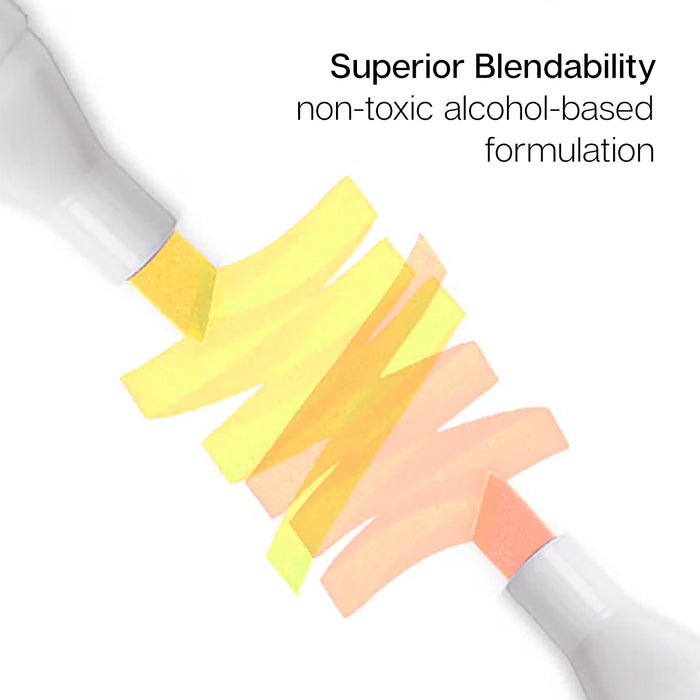 Our PRO double-ended art alcohol markers give each artist a professional-quality creative touch, with the richest saturations for everyone from the hobbyist to an experienced designer. With both a fine and chisel tip on this double-ended tool, you have the multifaceted artistic power for delicate lines and broad strokes right in the palm of your hand. These alcohol-based markers offer superior and smooth blendability for creating custom combinations with our brilliant color offerings. This PRO Kit offers 24 vivid colors for all your portrait art needs, with hues organized by caps and with a helpful color chart on the back of the box. Our alcohol markers are non-toxic and compliant with art material safety regulations, plus they’re easy to bring wherever you go in a handy, clear travel storage case. For best performance, use them on high weight paper that is bleedproof, uncoated, and smooth.