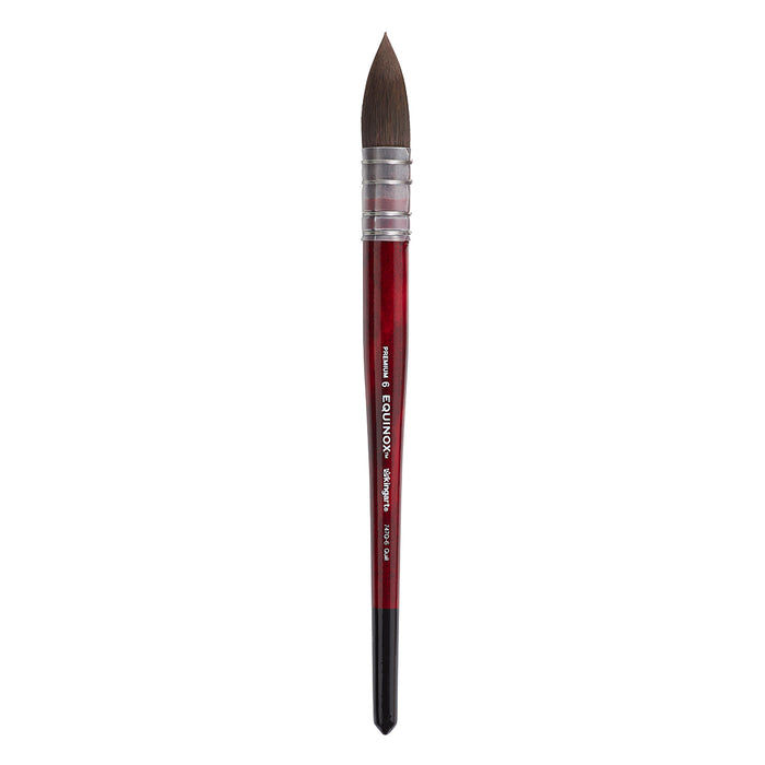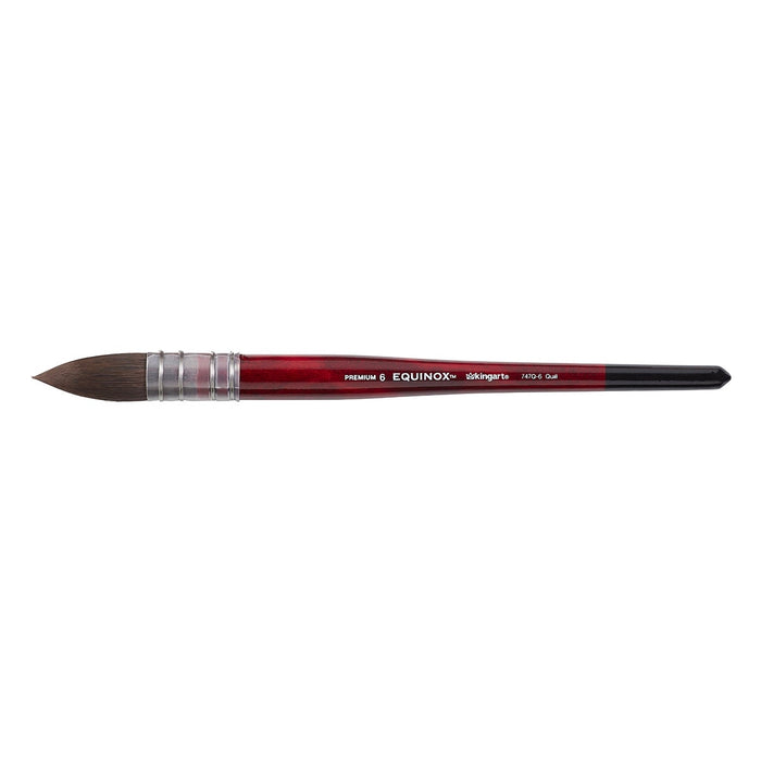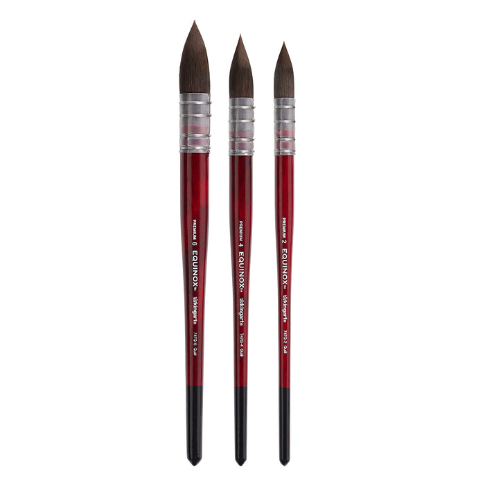 Equinox™ are superb quality brushes manufactured of a mix of triple width black synthetic fibers & synthetic Kazan Squirrel hair. The synthetic mix filament holds a huge amount of color and releases it with perfect control for the watercolorist, silk painter, and artists working with inks, dyes, acrylics, or gouache. Consistent water release and pigment flow like silk. Soft blend allows multiple layer glazing without disturbing previous colors, yet it's firm enough to lift color with a gentle scrub.