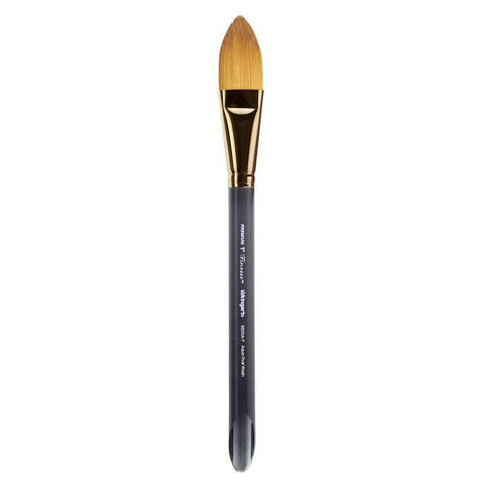 The  Finesse™ 8600A Series Aqua Oval Wash has rounded hairs, a flat ferrule, and produces a soft edge, with no point. Useful for laying in large areas of water or color, for wetting the surface, and for absorbing excess media. The Aqua series is an acrylic handle with a beveled edge scraper.  Can be used as a palette knife as well.