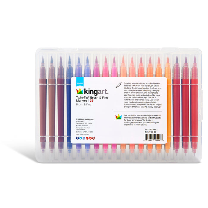 KINGART® STUDIO Twin-Tip™ Brush & Fine Tip Markers, 36 Colors - Brightly Colored Markers, Double Sided for Journaling, Lettering, Kids and Adult Coloring Books, and More, Comes with Durable and Convenient Carrying Case