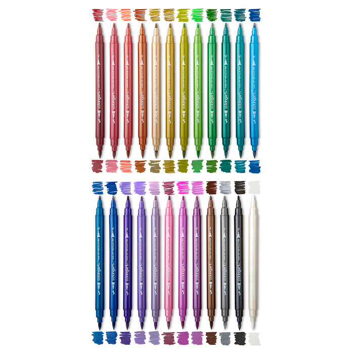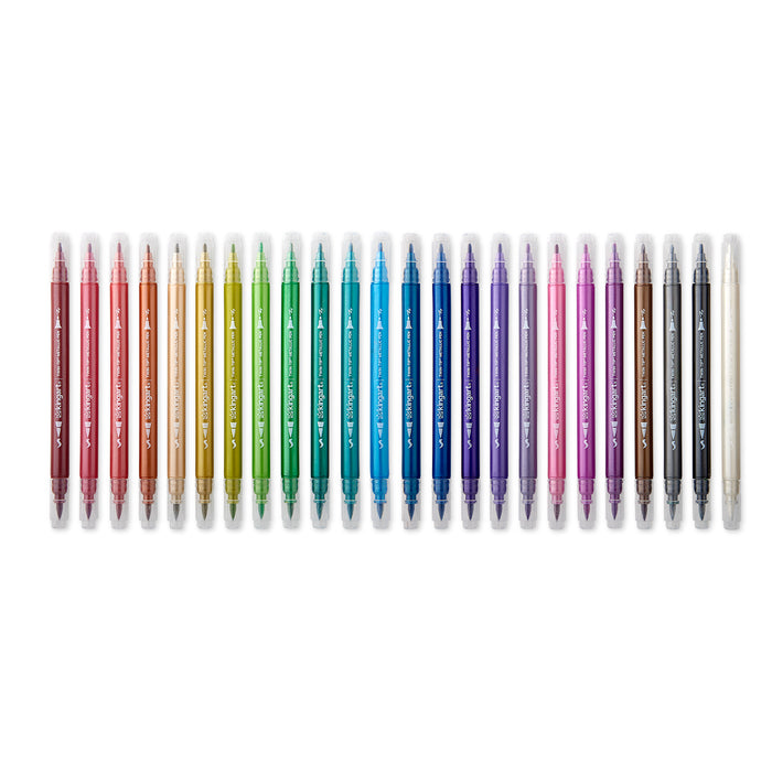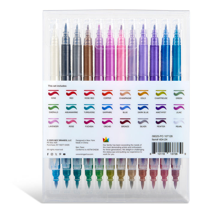 Double the tips, double the creativity. The KINGART® Twin-Tip® Metallic Pens come with both flexible brush tips and precise fine tips—giving you ultimate control for everything from bold strokes to intricate details. With 24 shimmering, water-based colors, this non-toxic set is perfect for lettering, illustrations, crafts, and embellishments on light or dark surfaces.